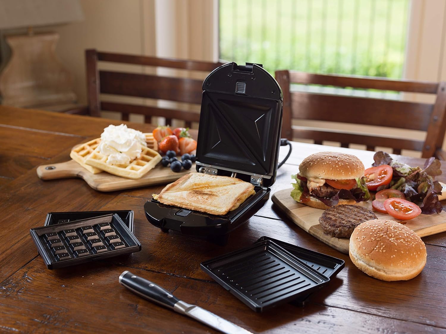 Приготуйте смачні сендвічі, вафлі, гамбургери тощо за допомогою цієї фантастичної компактної закусочної машини 3 в 1 від Bestron.
